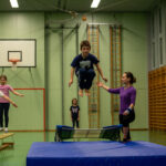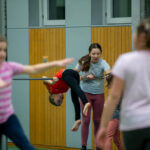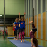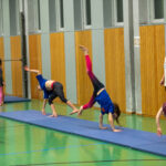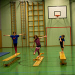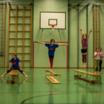 Ungezwungenes Üben der Grundfertigkeiten mit vielen Kleingeräten (Tüchern, Schnüren, Teppichfliesen,…) und an den Großgeräten wie Barren, Langbänken, Balken usw.
