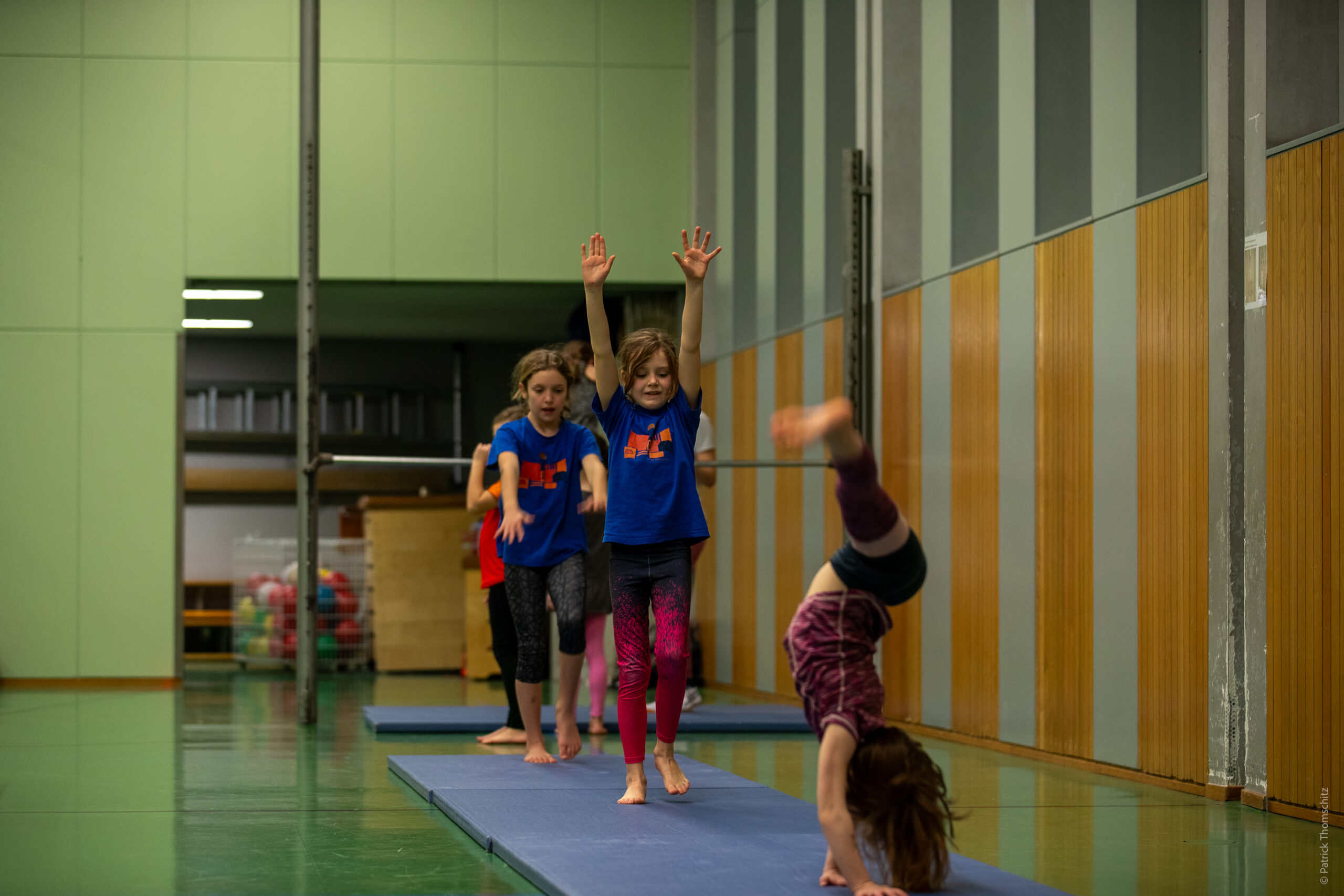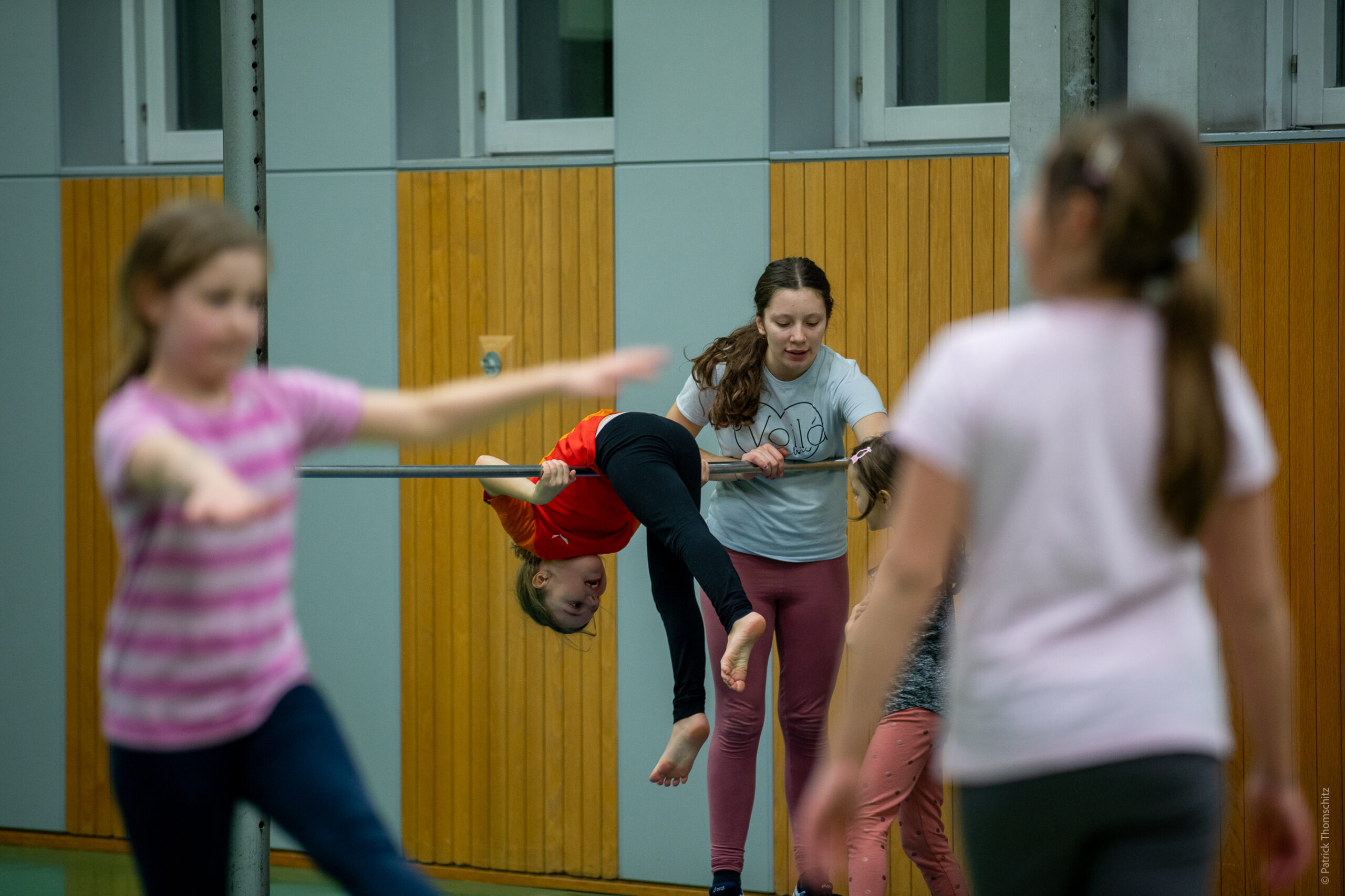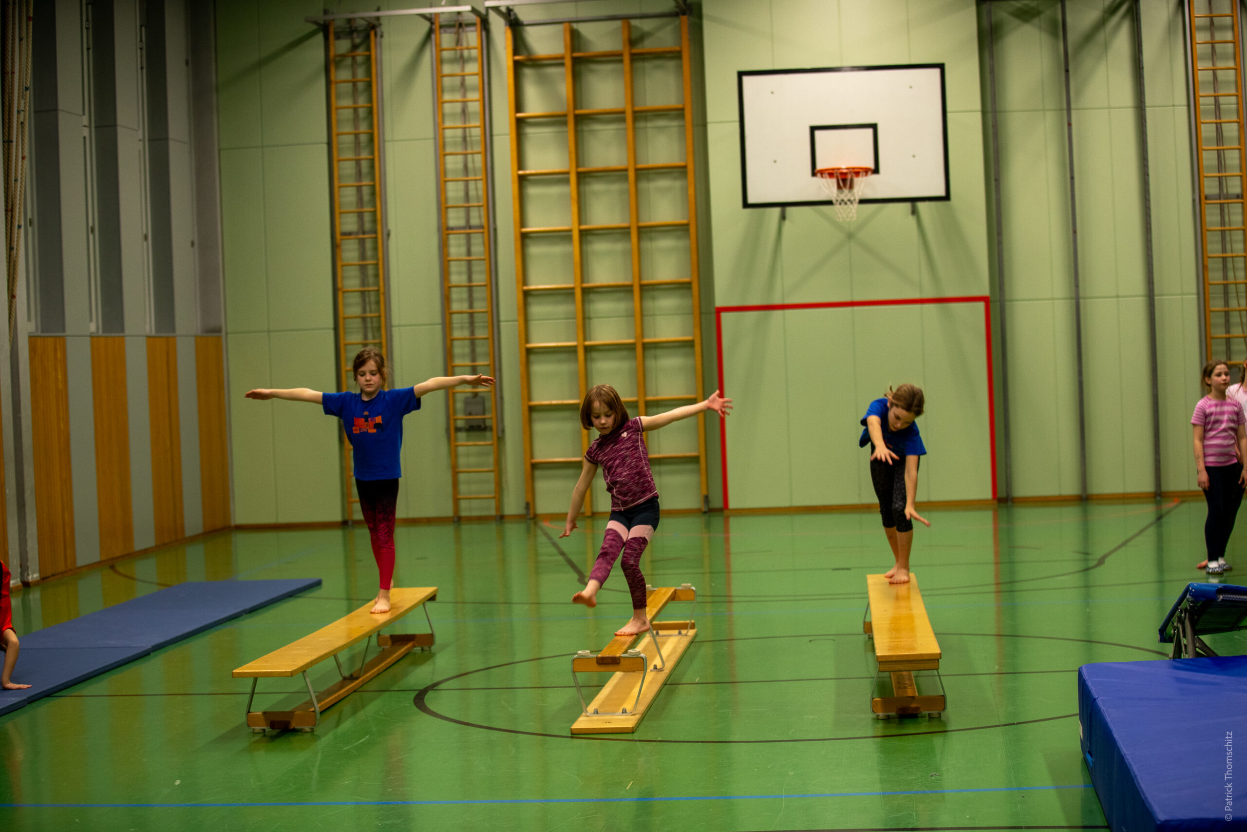 Ungezwungenes Üben der Grundfertigkeiten mit vielen Kleingeräten (Tüchern, Schnüren, Teppichfliesen,…) und an den Großgeräten wie Barren, Langbänken, Balken usw.